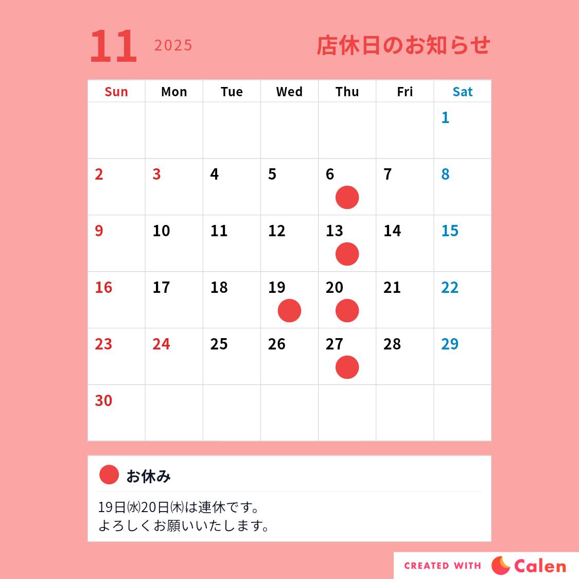 毎週木曜に加え、19日㈬・20日㈭が連休となります。